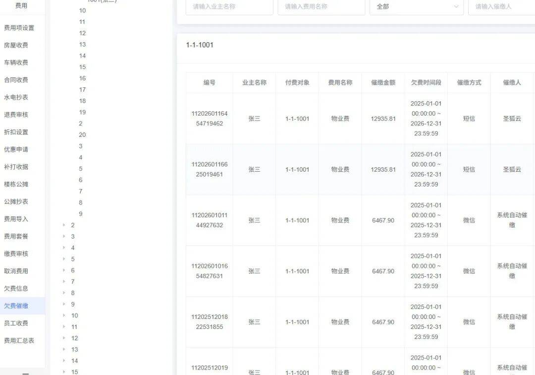 圣狐云智慧物业系统的催缴管理功能,彻底跳出“单一追款”的思维局限,从“资产维度”和“人员维度”双向拆解欠费情况,让催缴工作从盲目推进转向精准施策,每一步都有明确方向。