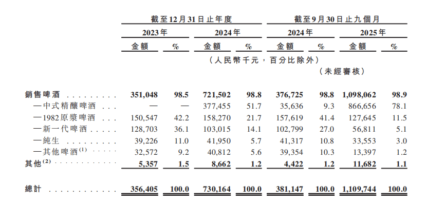 与之相对的是,金星啤酒的传统啤酒业务全面萎缩。1982原浆啤酒收入占比从2023年的42.2%骤降至2025年前三季度的11.5%;新一代啤酒从36.1%跌至5.1%;纯生及其他产品线同样大幅下滑。